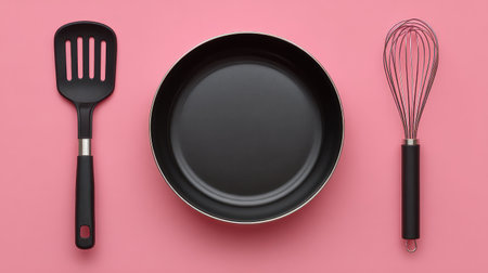 A striking composition of essential kitchen tools displayed on a vibrant pink background, showcasing a nonstick pan, spatula, and whisk. Perfect for culinary inspiration.