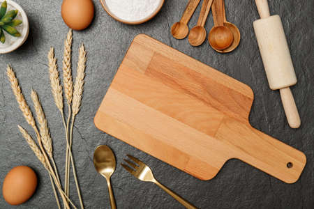 Preparation Cooking Accessories Kitchen Composition Black Table Wooden Metal Dishes Ware Different Support Stuff Top View Flat Lay