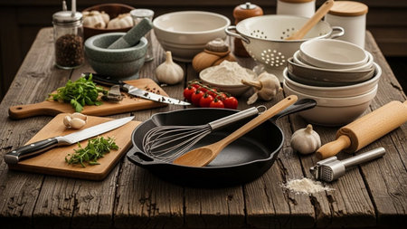 Rustic Kitchen Setup with Cooking Ingredients and Utensils.