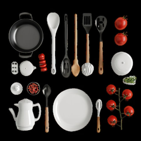 edgy flatlay of metal cooking tools against black background, created with generative ai