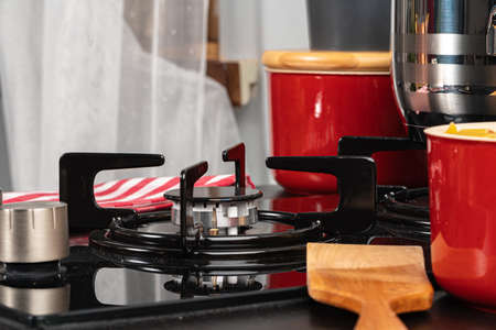 Close-up of the kitchen cooker. Black gas hob on black marble.