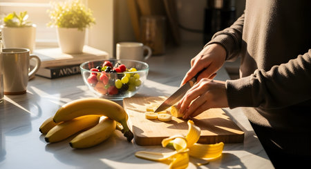 A person slices a fresh banana on a wooden cutting board in a sunlit kitchen, with a bowl of berries in the background. The image conveys concepts of healthy eating, breakfast preparation, and nutrition.