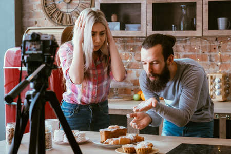 Young family cooking. Vlogging hobby. Homemade bakery. Man dusting pastries with icing sugar. Woman panicking. Camera on tripod.