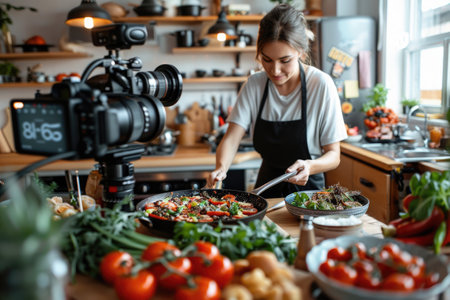 Young woman recording a video lesson on cooking in the kitchen