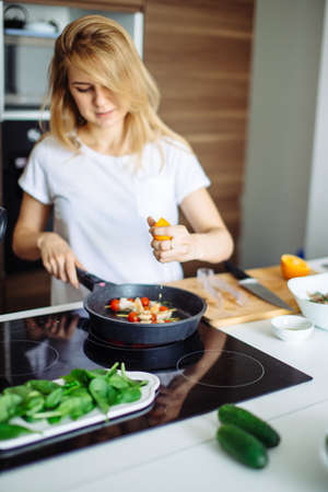 Young housewife cooking in kitchen, squeezing the orange on the frying pan