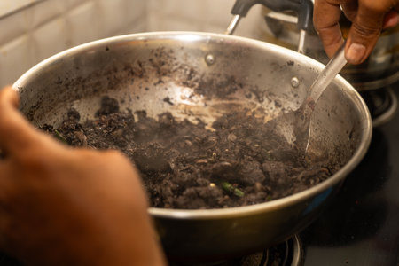 A butcher is chopping up mutton meat and mixing it with blood, spices, and other ingredients. The fry is then cooked in a pan until it is crispy and brown.