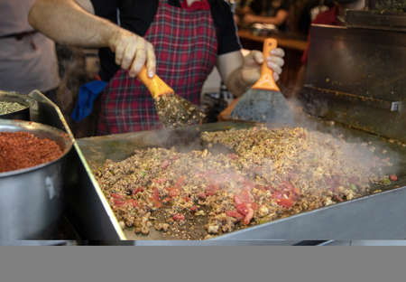 Meat on frying pan. Street food and outdoor cooking concept Toned picture