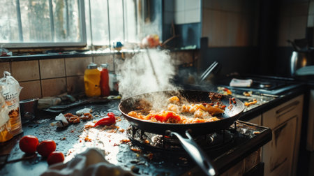 A cluttered kitchen scene revealing the challenges of meal preparation. Dirty dishes and a stained frying pan reflect chaotic cooking experiences at home.