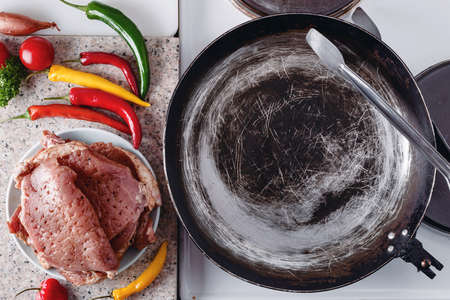 Pork steak ready to be roasted on rustic pan, fresh hot chili peppers, tomato and herbs.