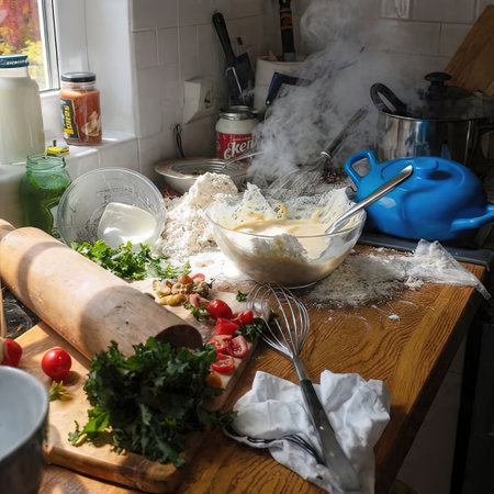 A chaotic kitchen filled with dirty dishes and remnants of cooking, illustrating the challenges of maintaining cleanliness in a busy home cooking environment.