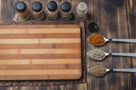 Cooking ingredients. Various spices and cutting board on wooden table. Top view