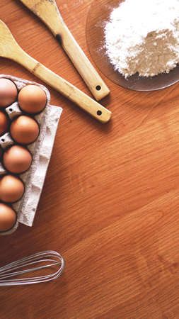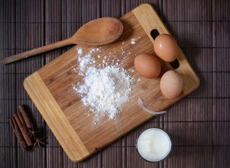 Ingredients for homemade bread or pasta. Eggs, milk, flour on a rustic table top view. Backing background.