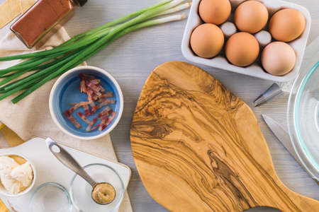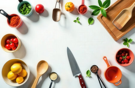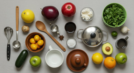 Flat Lay of Fresh Ingredients and Kitchen Utensils on Light Surface