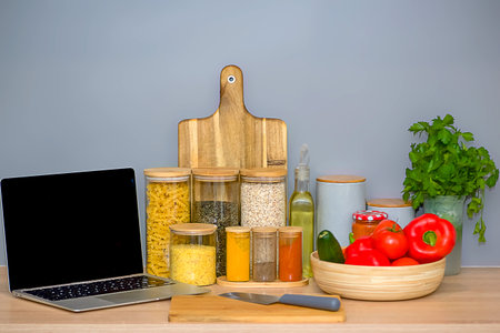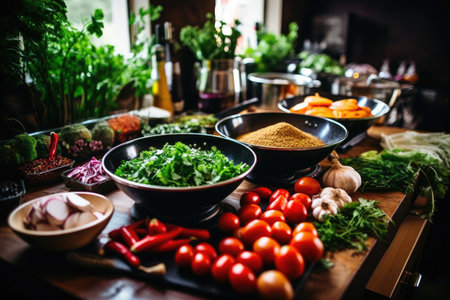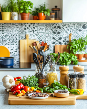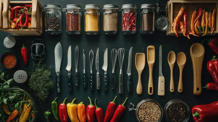 A vibrant kitchen setup featuring an array of spices, fresh peppers, and cooking utensils beautifully arranged for a culinary experience.