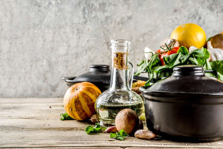 Healthy food herbs Spices for use as cooking ingredients on a wooden background with Fresh organic vegetables on wood. The concept of food ingredients with Variety on the rustic table.
