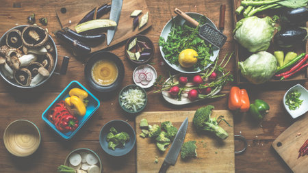 A rustic kitchen scene featuring fresh ingredients like chopped vegetables, bowls of tomatoes, and kitchen tools on a wooden table, perfect for healthy meal preparation.