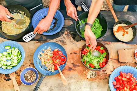 An overhead view of a beautifully set dining table featuring a salt cellar and fresh ingredients, highlighting the role of seasoning in meal preparation.