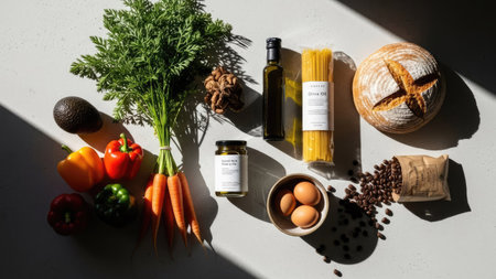 An overhead shot presents a selection of fresh food items. Colorful vegetables, including carrots and peppers, are arranged with pasta, bread, eggs, olive oil, and coffee beans. The composition features natural lighting and shadow play, set against a neutral background. Suitable for culinary, health, and lifestyle visual communication.
