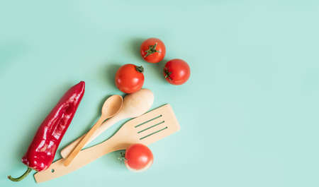 Tree shoulder blades and spoons with ripe tomatoes lie on a light background. View from above, place for inscription.