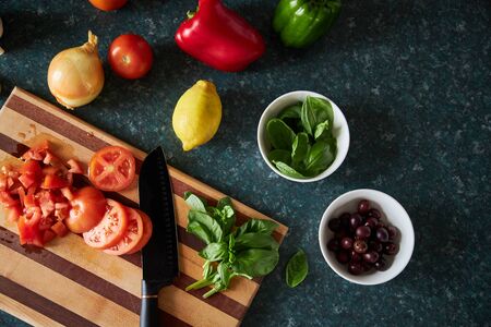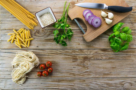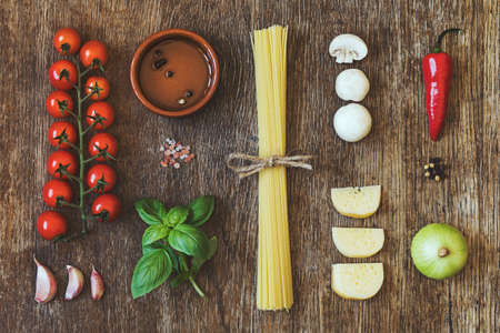 Stylish composition of fresh, italian ingredients and food on the vintage wooden table. Culinary backgrounds. Top view.