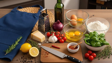 Rustic Kitchen Setup with Cooking Ingredients and Utensils.