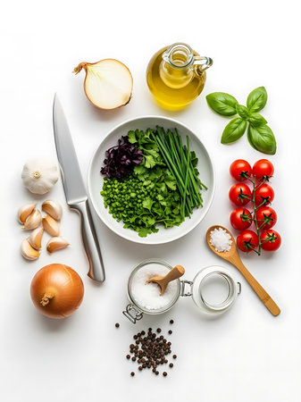 A beautifully arranged flat lay of fresh vegetables, herbs, and essential kitchen tools, ready for culinary preparation, showcasing vibrant colors and textures.
