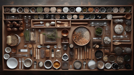 Spices and herbs in a wooden kitchen cabinet. Top view.
