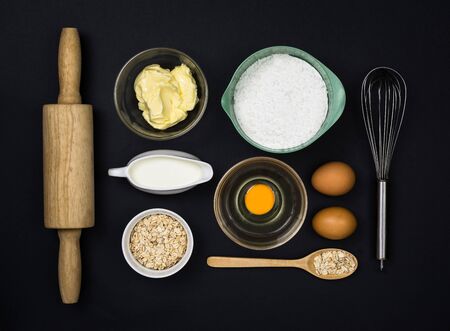 tools and ingredients for the dough (flour, butter, eggs, milk, Oatmeal) on black background. Top view.
