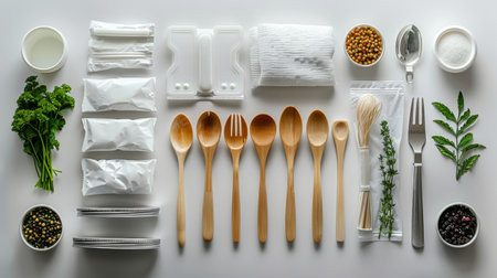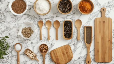 This visually appealing flat lay captures an assortment of wooden utensils and spices on a elegant marble surface, perfect for culinary inspiration and food styling.