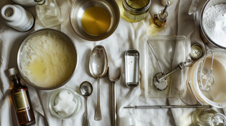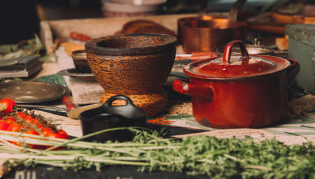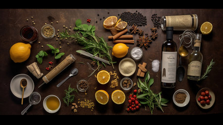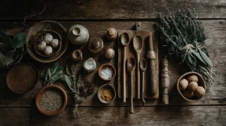A charming arrangement of natural ingredients and rustic kitchen utensils on a wooden table, perfect for culinary and herbal preparations with earthy textures.