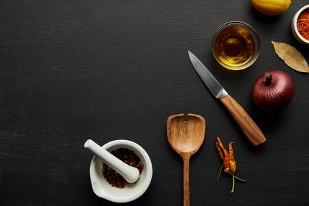 Top view of wooden spatula, knife with spices and olive oil on black wooden background