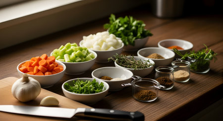 A wooden kitchen counter displays a meticulously prepared 'mise en place' with bowls of chopped celery, carrots, onions, and various spices. Fresh herbs and a garlic bulb sit nearby, ready for a cooking session.