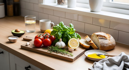 A wooden kitchen counter displays fresh cooking ingredients including vine tomatoes, fresh basil, garlic bulbs, a lemon, a loaf of sliced bread, and a small dish of olive oil. The scene evokes healthy cooking, Mediterranean diet, and culinary preparation in a bright kitchen.