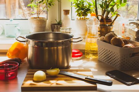 Close-up view stainless pan, wooden desk with onion half cut. Box of potatoes and other raw vegetables on the surface. Traditional soup recipy. Smartphone placed near for recipe reading