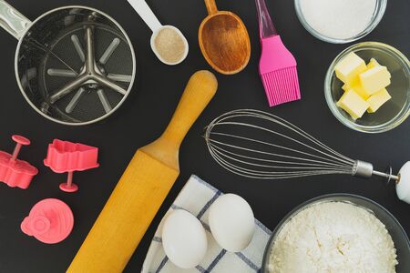 Flat lay ingredients for baking and kitchen utensils on a black background. Top view, horizontal orientation, selective focus.
