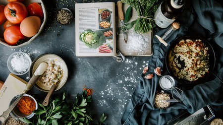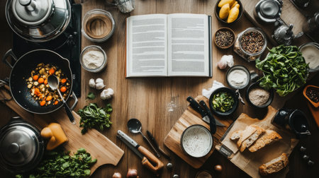 A high-angle shot of an organized kitchen countertop with various cooking tools, ingredients, and a recipe book open, illustrating a well-prepared cooking space.