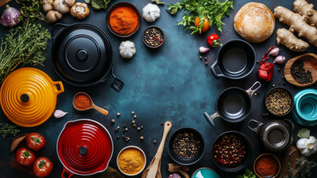 A vibrant flat lay of various cooking pots and pans arranged with fresh ingredients, spices, and utensils, showcasing the essentials for a home-cooked meal.