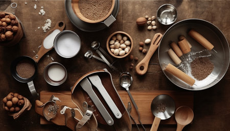 Rustic wooden spoon stirs homemade cookie dough in metal bowl generated by artificial intelligence