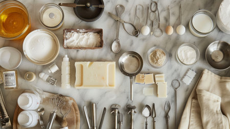A top-down view of an artistically arranged assortment of kitchen utensils on a marble countertop. High quality photo