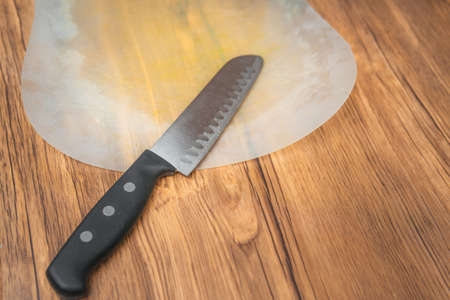knife on a wooden table close-up kitchen background image