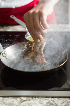 Cook puts raw lamb ribs on frying pan close up