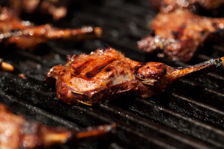 Closeup of grilling pork ribs, homemade barbecue.