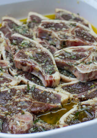 marinated lamb steaks prepared on a plate for a barbecue party in the garden