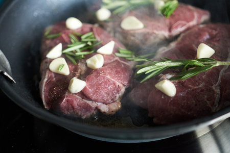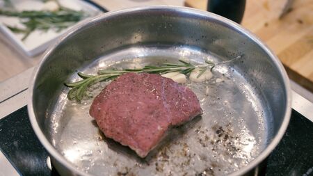 Beef steaks with garlic and rosemary in a frying pan.