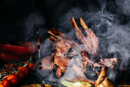 Grilled lamb ribs on the grill with smoke. Roasted Rectangle Rack of Lamb Chops. Culinary, cooking, bakery concept,