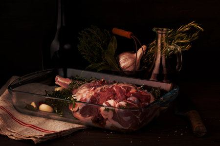 Fresh raw lamb leg ready for roasting with garlic and herbs