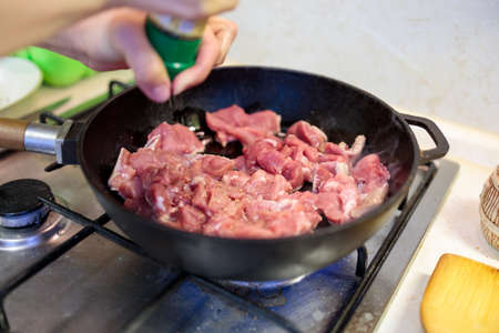 woman peppers meat that is fried in a pan, hands close-up