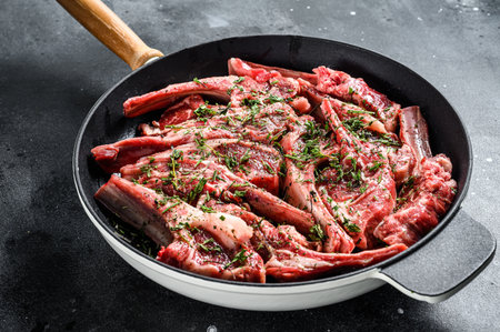 Raw fresh lamb rib chops marinated with thyme and mint in a pan. Black background. Top view.