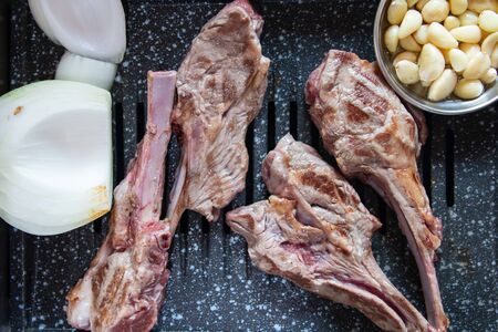 Grilled lamb ribs on grill. Hot rack of lamb with grilled vegetables, Culinary, cooking, bakery concept,