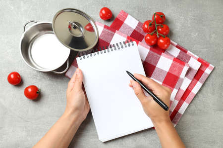 Cropped shot of female student taking recipe notes on blank notebook on black kitchen table in cooking class